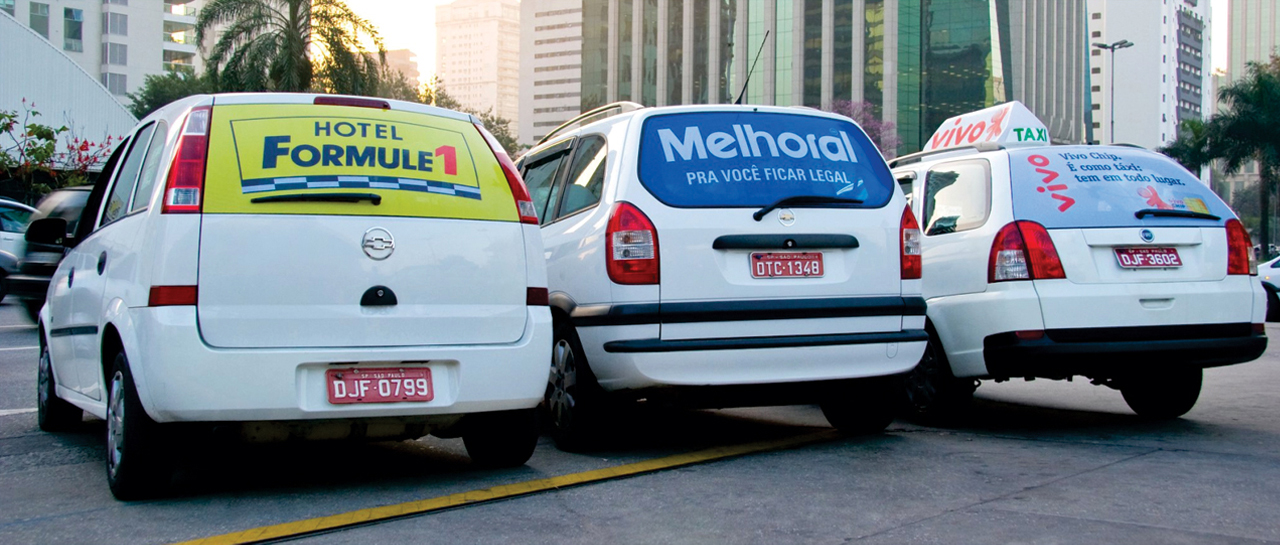 Ja as empresas de Táxi, (veja nossa Pagina de cartão de visita Taxi) aproveitando também o seu fluxo diário, investem em propagandas no Vidro Traseiro de seus veículos. Porém não às utilizam para si propias, mas sim, para aqueles que desejam anunciar os seus serviços, ou seja, elas alugam o vidro para colocar ali uma propaganda durante um certo período a combinar.